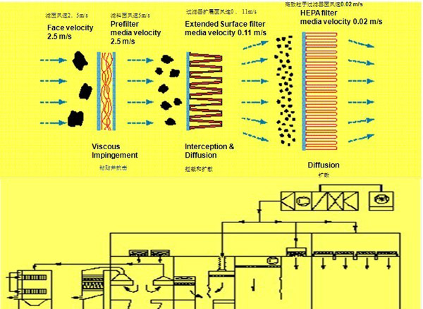 空調(diào)送風(fēng)系統(tǒng)通過一定的流速將灰塵送到過濾系統(tǒng)當(dāng)中,初級過濾器將5um以上大顆?;覊m留在過濾表 面,中效過濾器將1um-5um顆粒抓取,高效過濾器將0.3um-0.5um以上灰塵顆粒過濾,從而保證無塵車間等級!