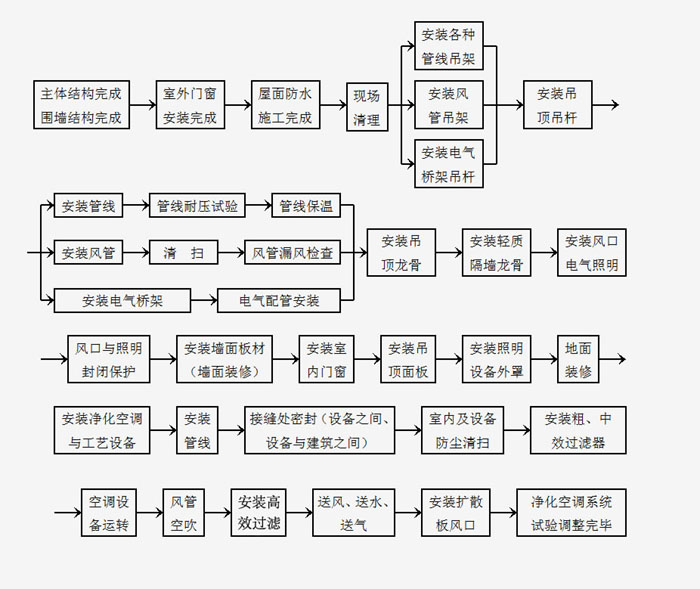 3、凈化工程設(shè)計應(yīng)為施工安裝、維護管理、測試和安全運行創(chuàng)造必要的條件。