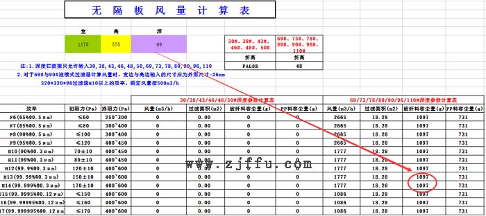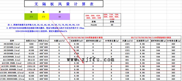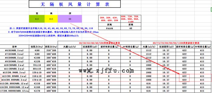 610*610*69mmFFU高效過濾器的容塵量表格
